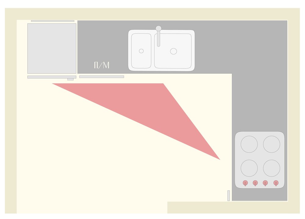 Уже давно выяснено, что рабочая зона строится вокруг трех основных точек , а именно: плита, холодильник и мойка. При соединении этих точек получим треугольник. Для комфортной работы на кухне, при перемещении по этому треугольнику ничего не должно мешать, а сумму сторон треугольника не должна превышать 7 метров.