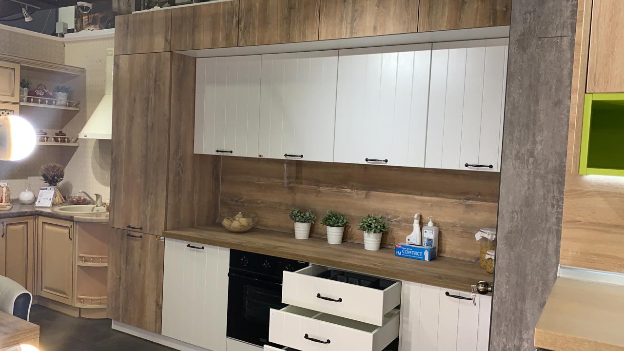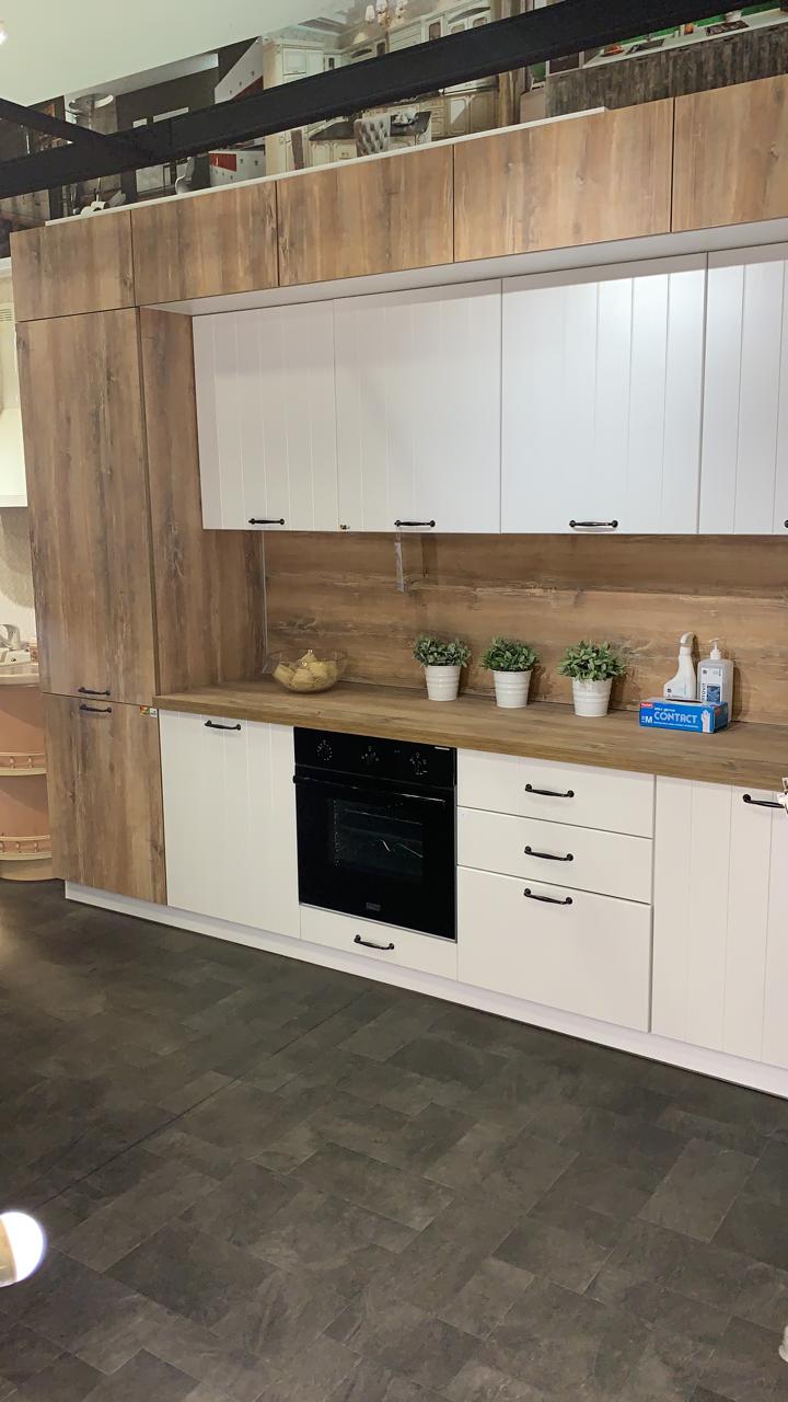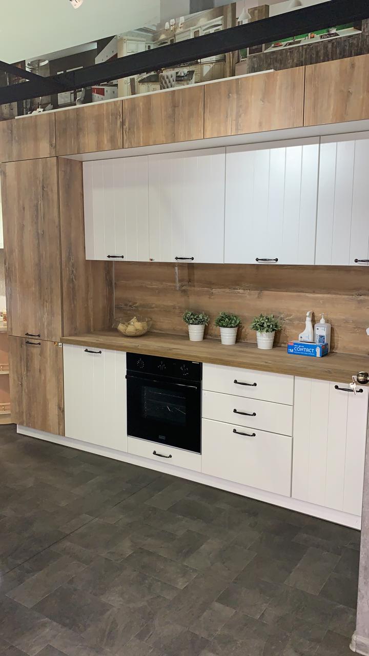 Материал стеновой панели: Пластик древесной структуры в цвет боковины пенала под холодильник и столешницу