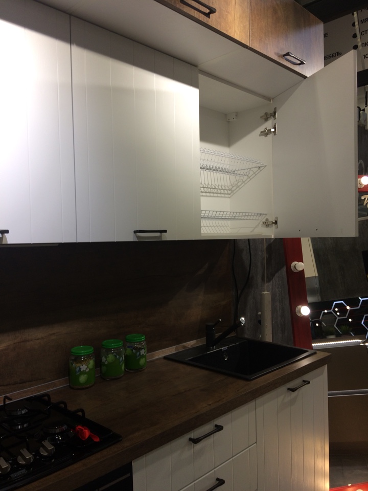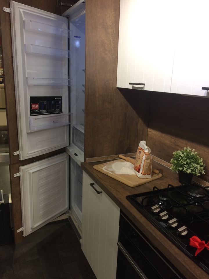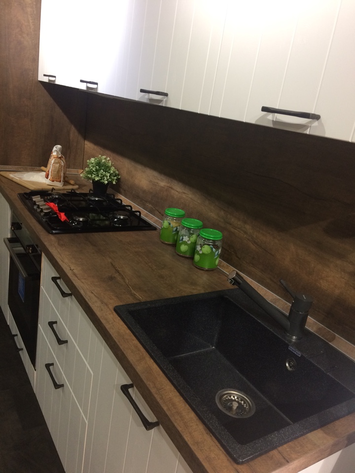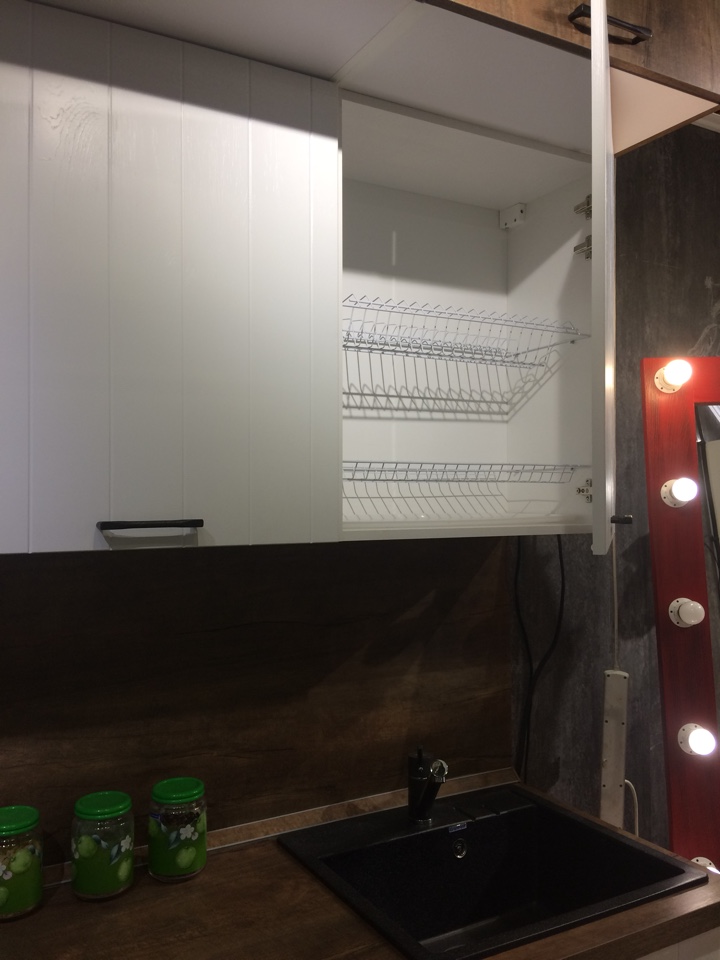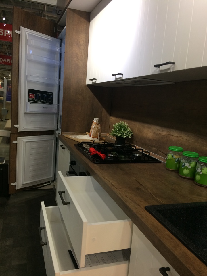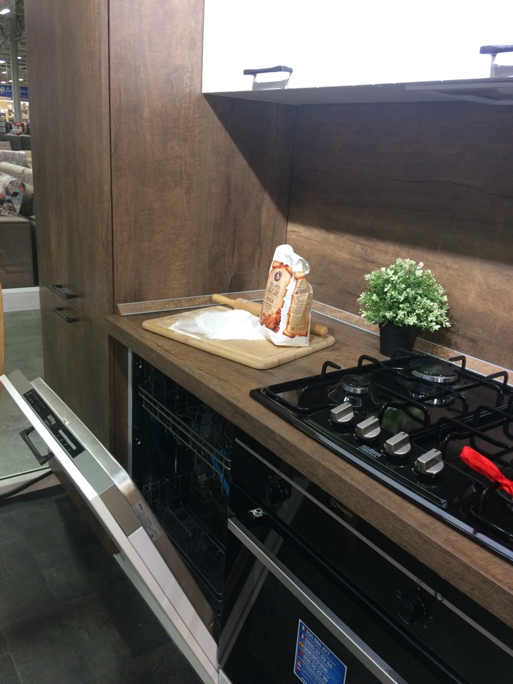 Материал стеновой панели: Пластик древесной структуры в цвет боковины пенала под холодильник и столешницу