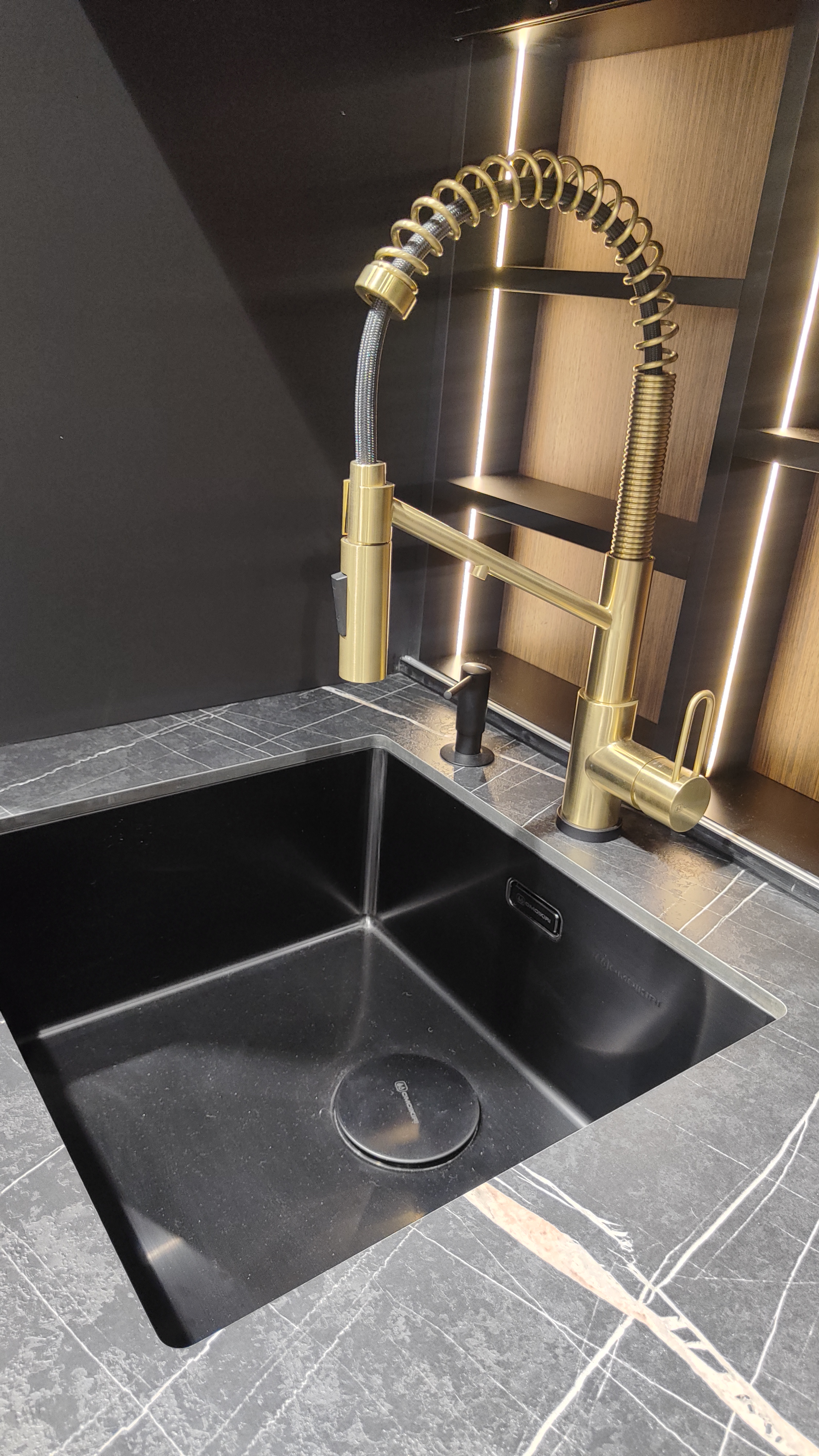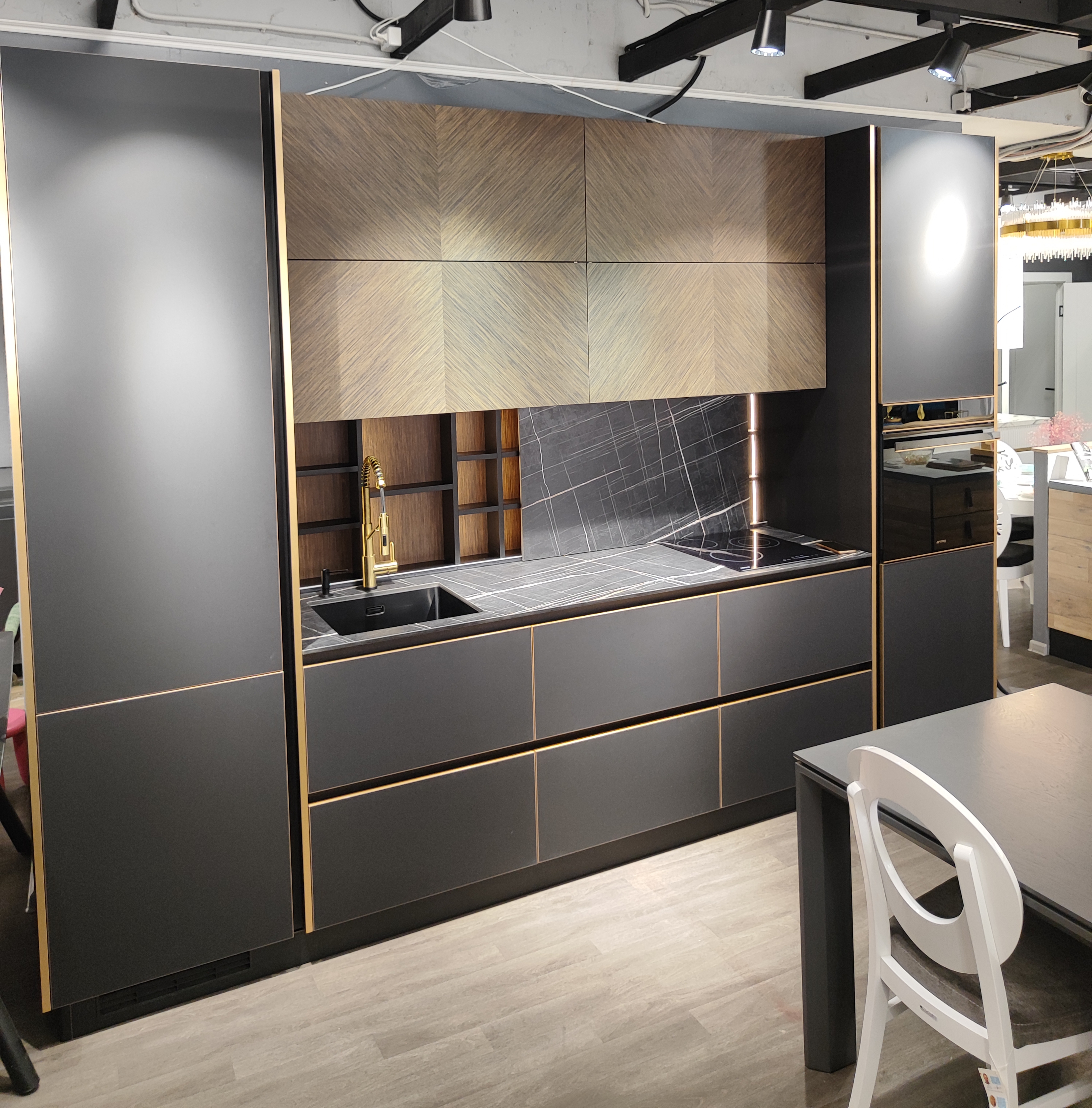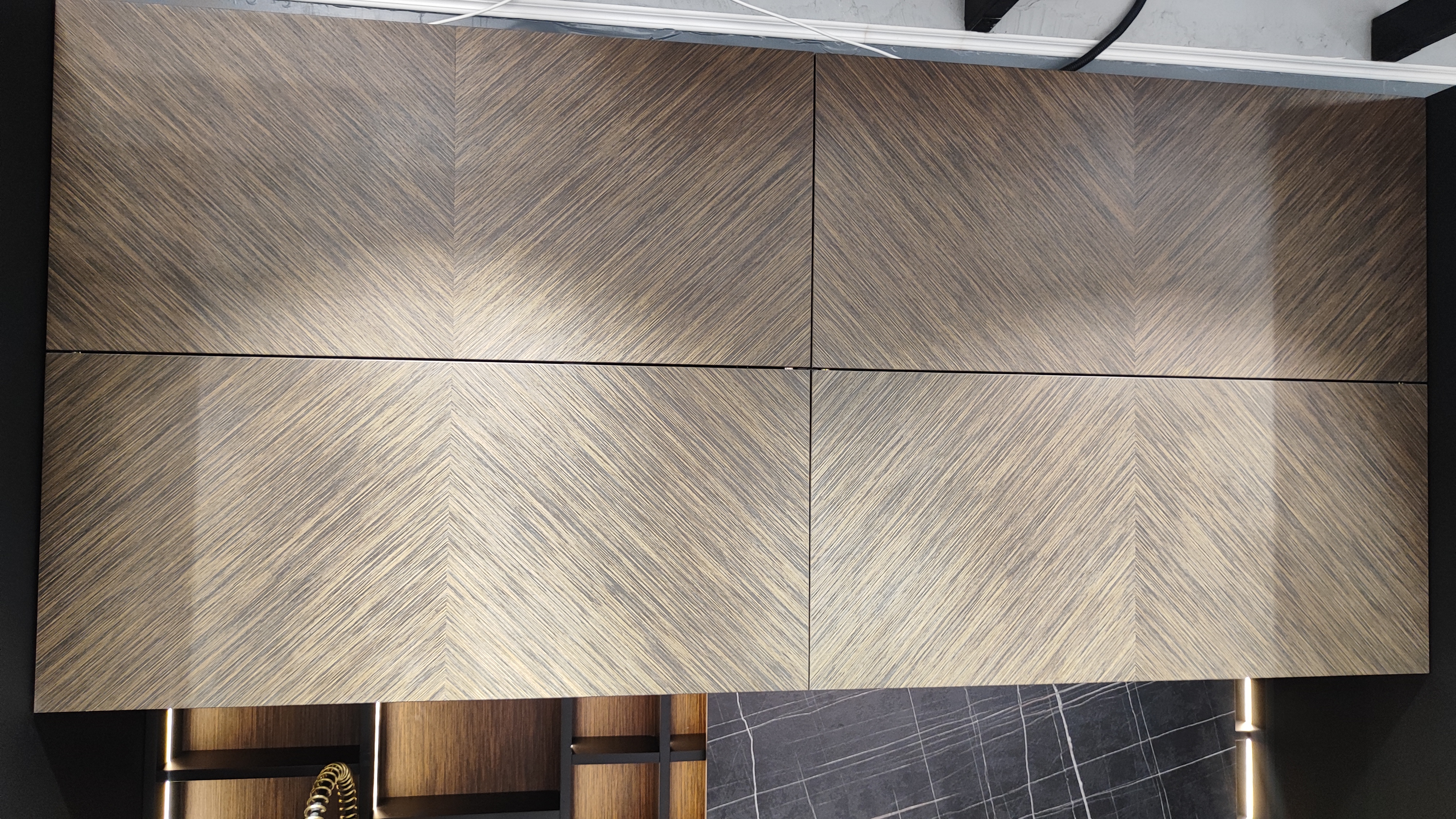 Материал фасада : Шпон - уникальный сборный рисунок + Egger Perfect Sense суперматовый + эксклюзивная бронзовая декоративная кромка по периметру фасада + алюминиевый профиль GOLA