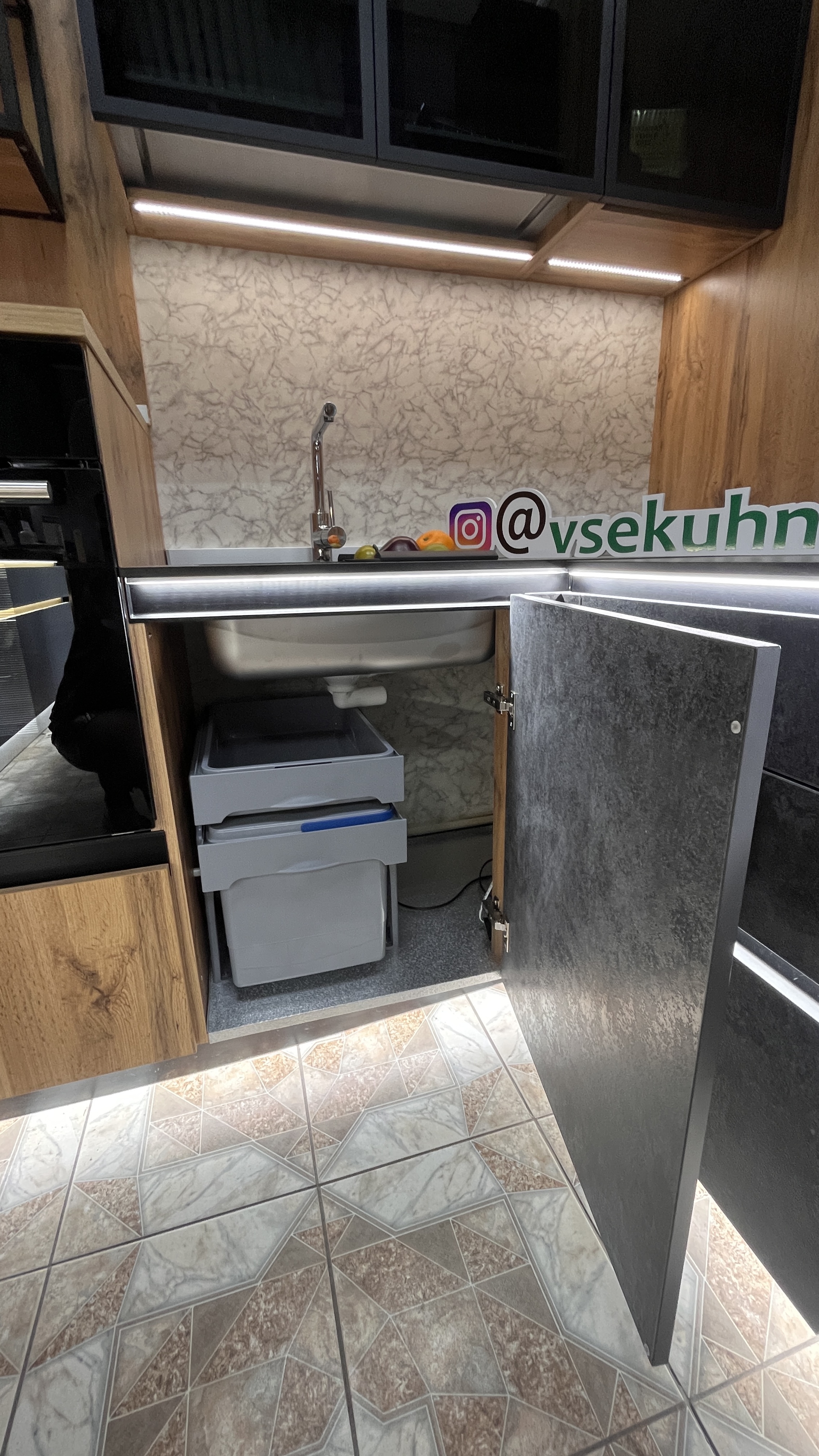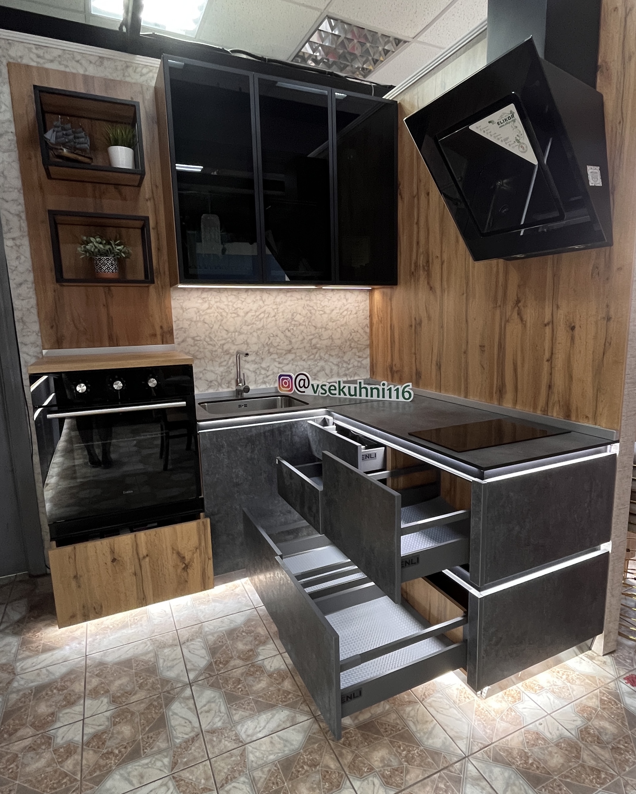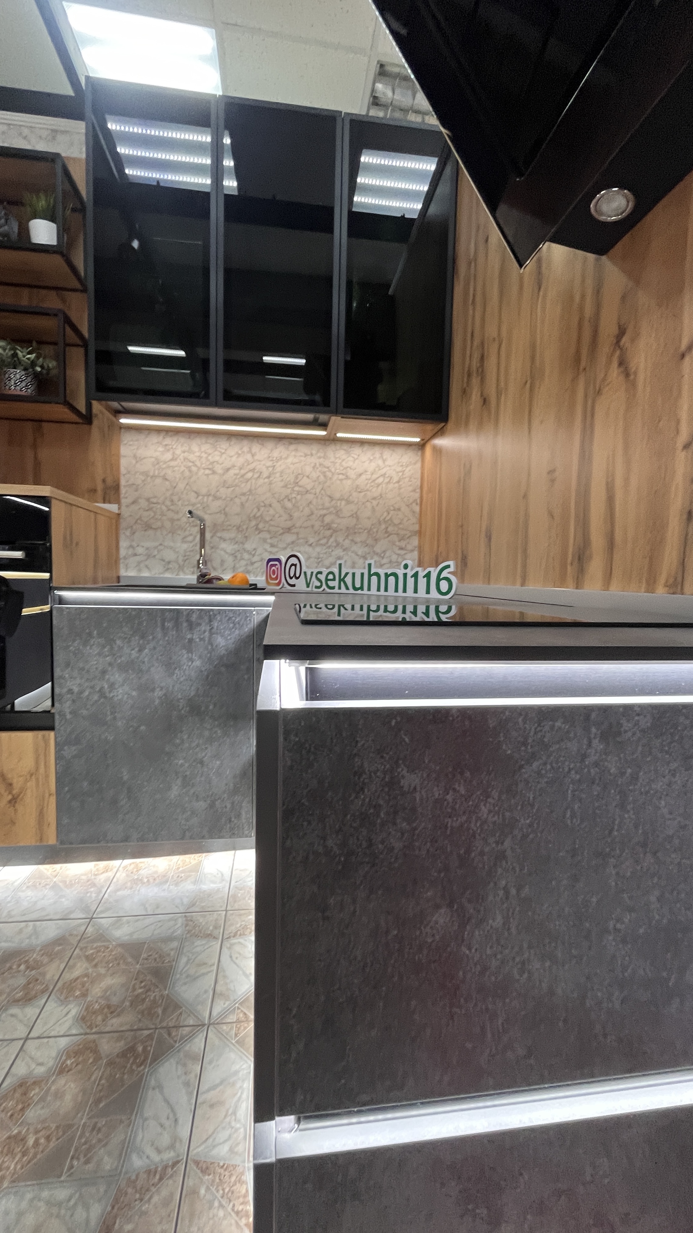 - Встроенная подсветка столешницы + нижних модулей по периметру