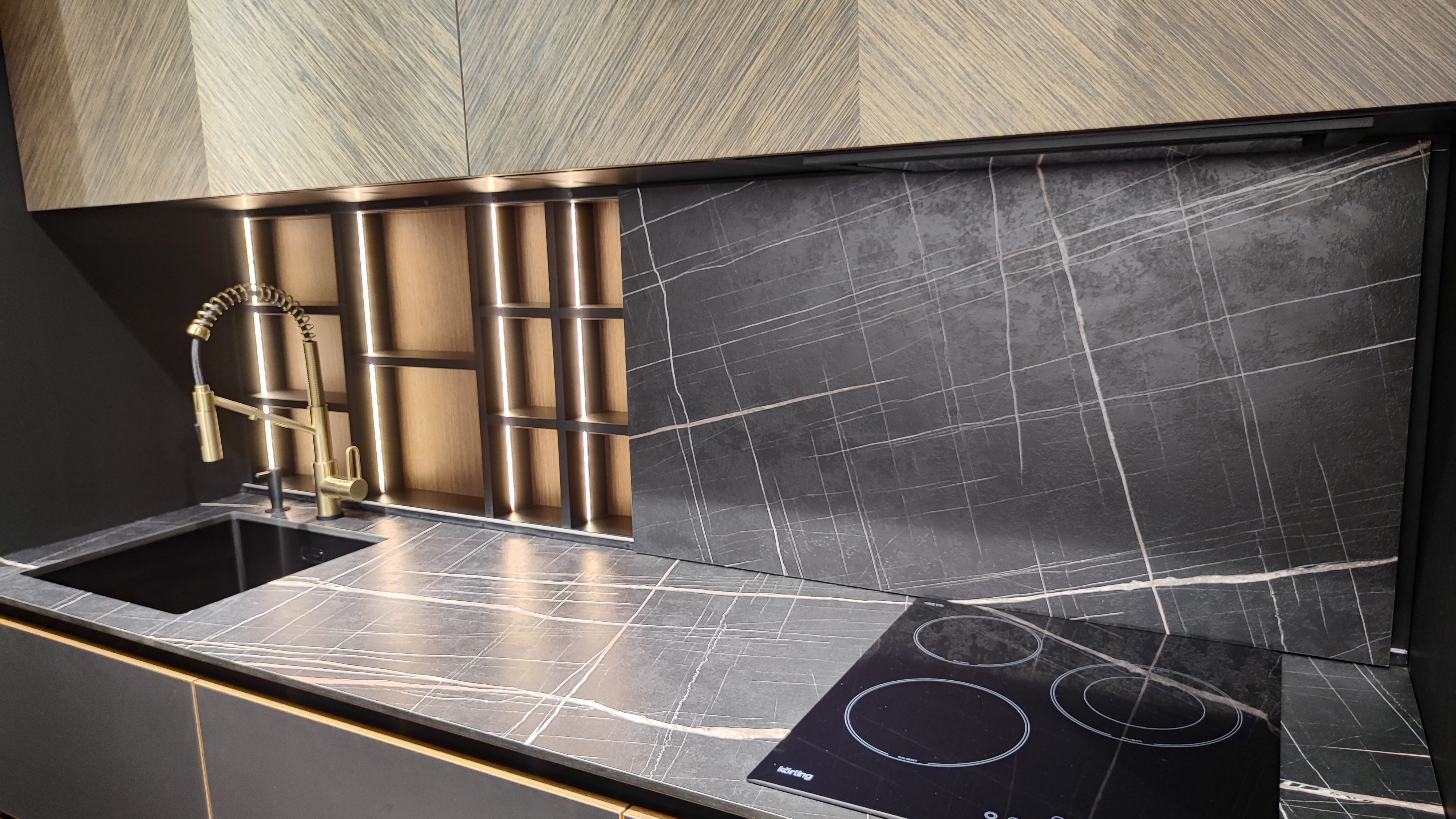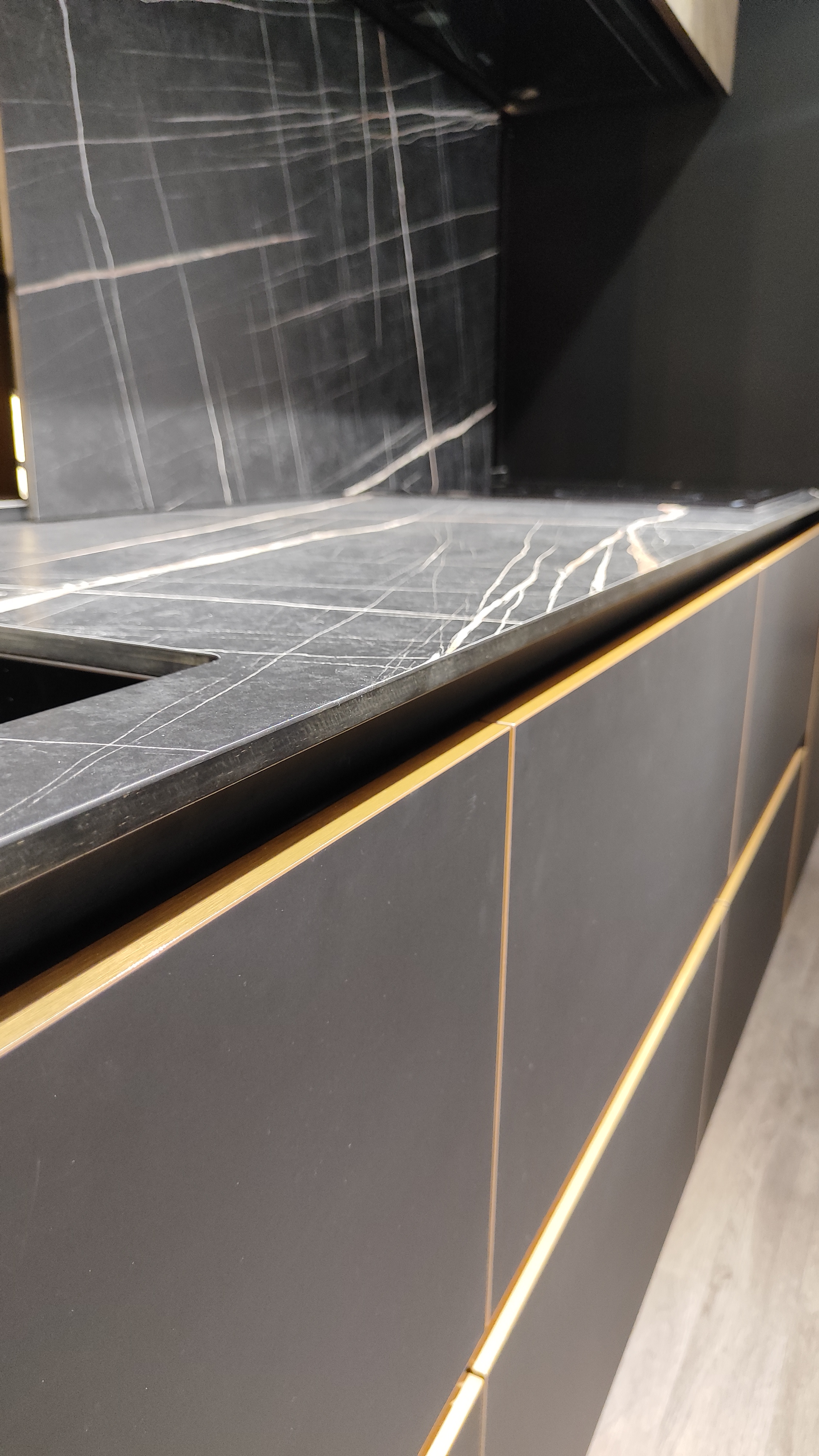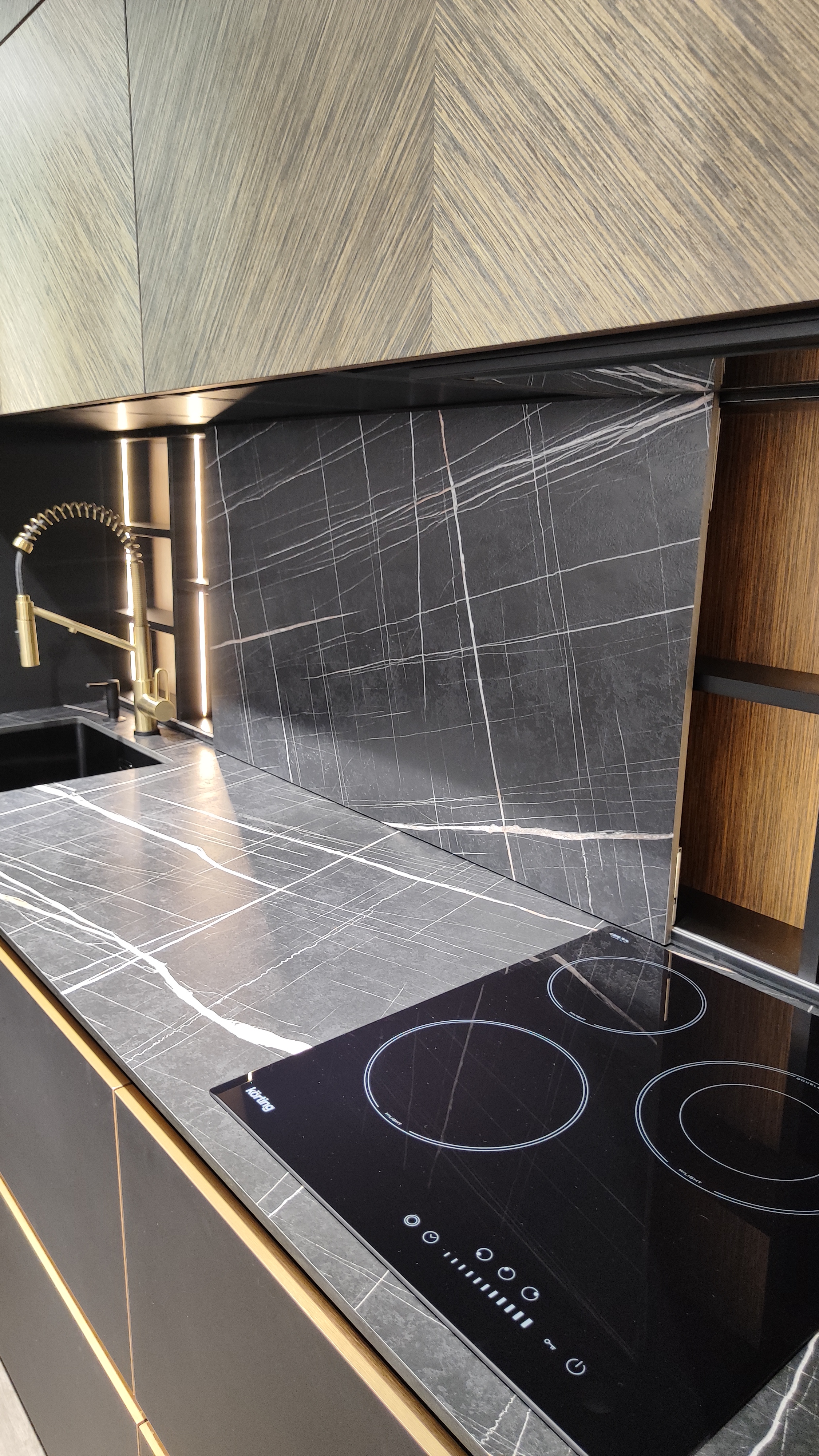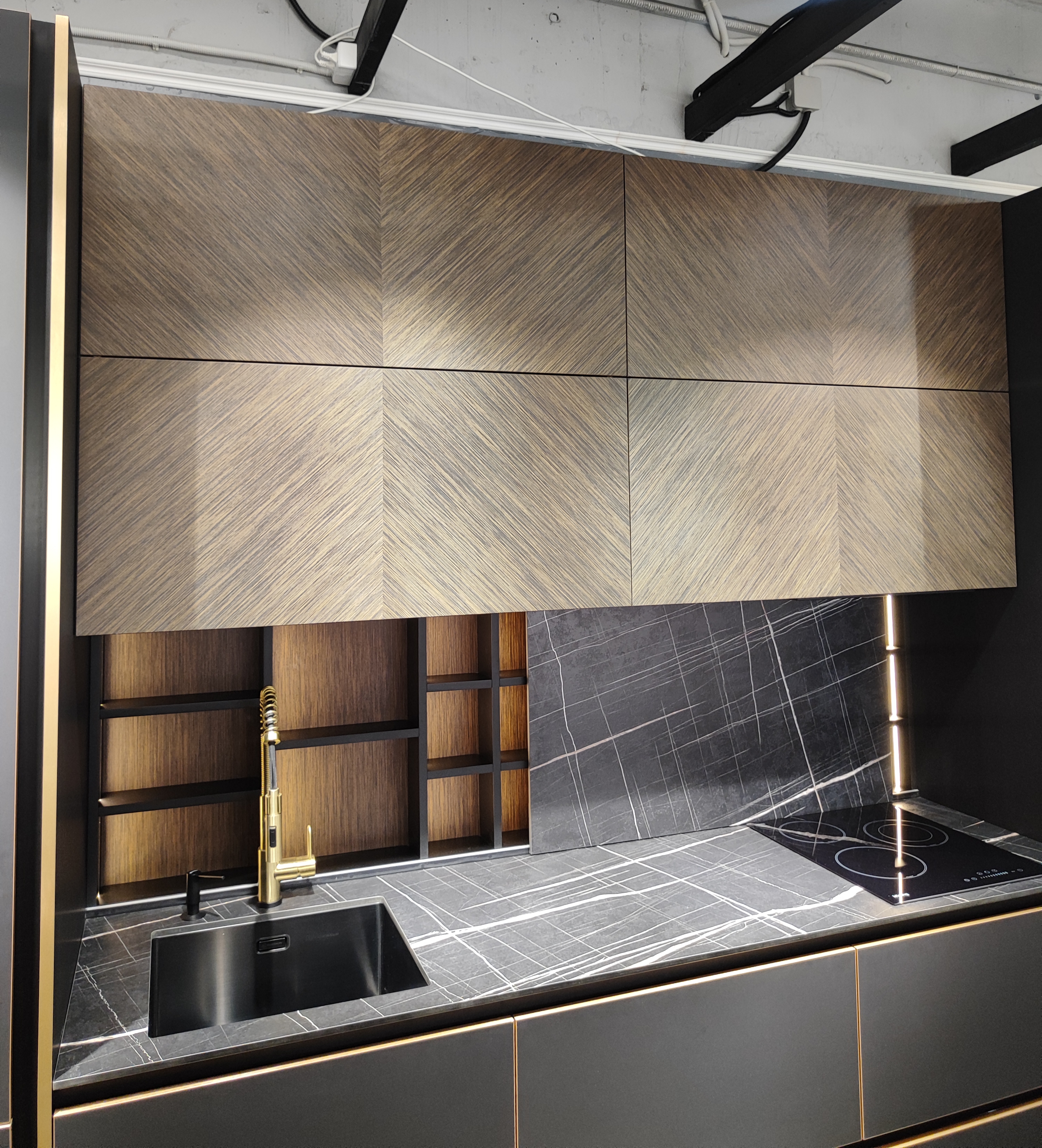 Материал фасада : Шпон - уникальный сборный рисунок + Egger Perfect Sense суперматовый + эксклюзивная бронзовая декоративная кромка по периметру фасада + алюминиевый профиль GOLA