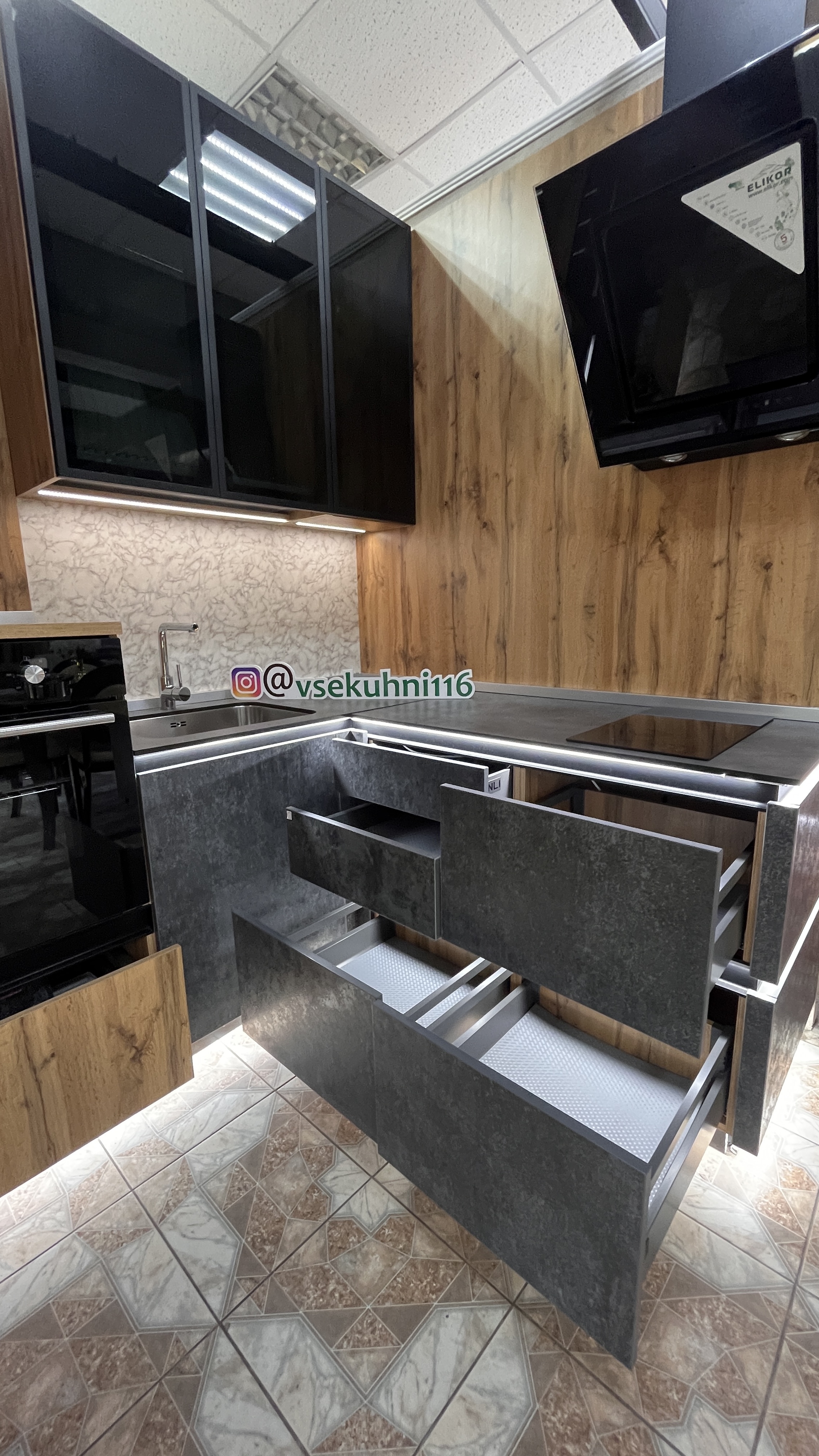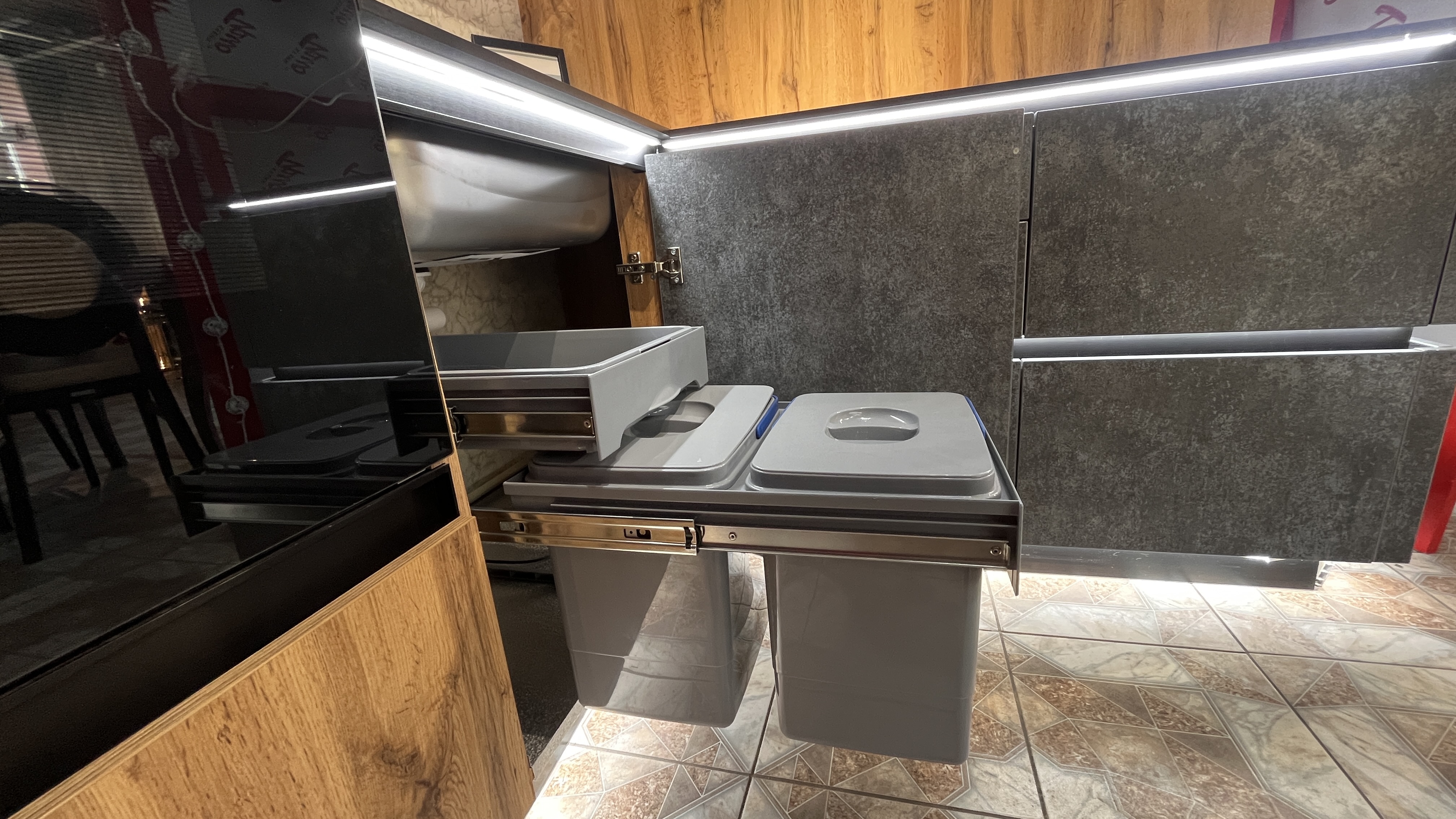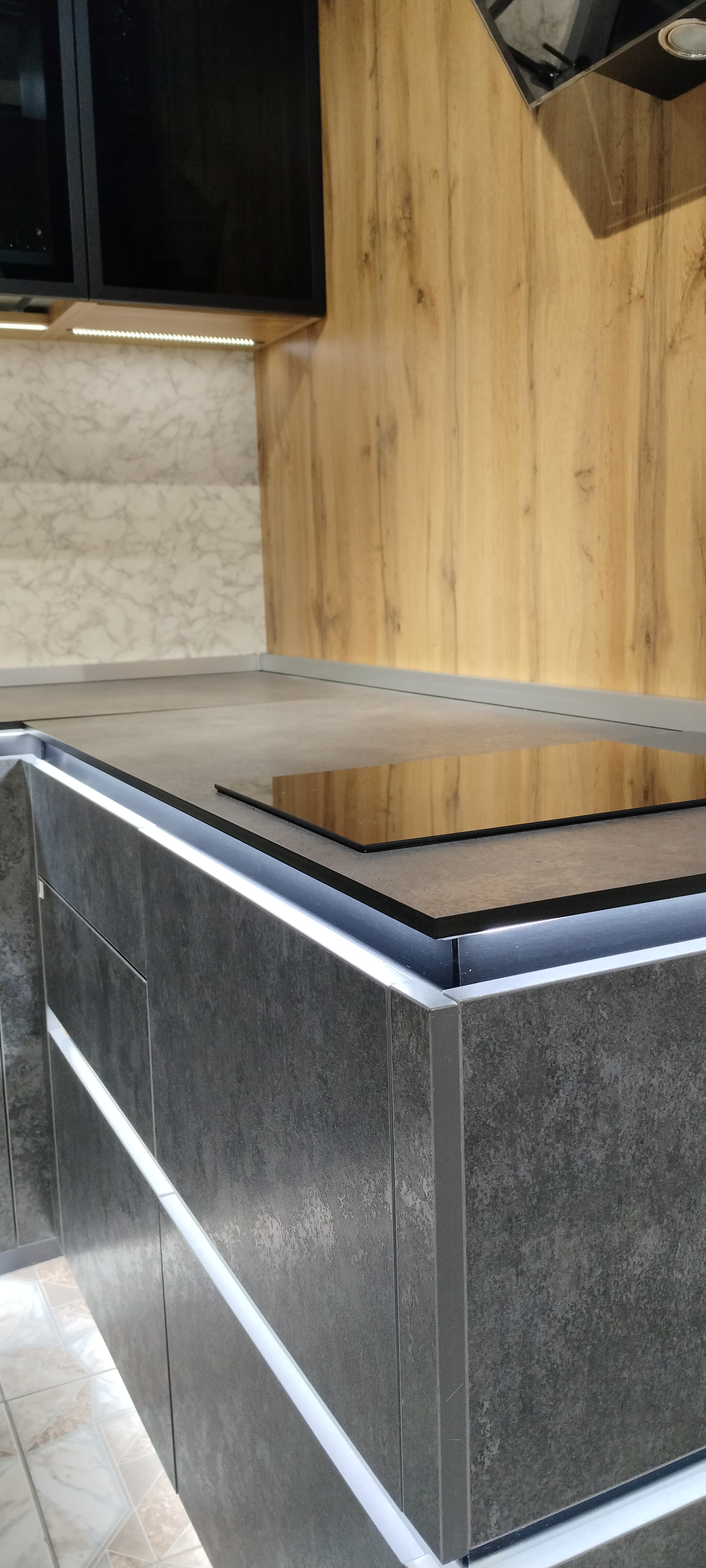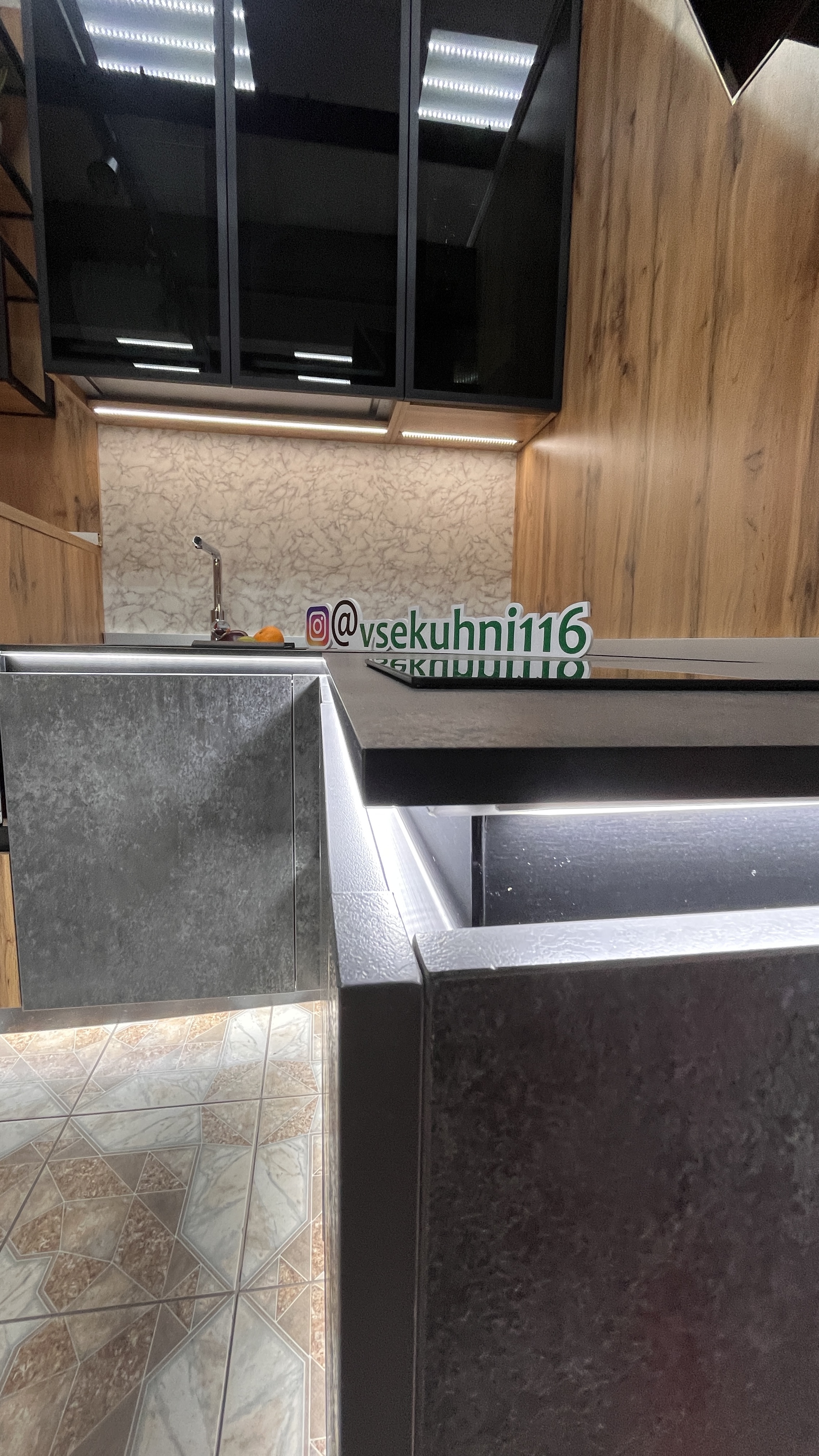 - Встроенная подсветка столешницы + нижних модулей по периметру